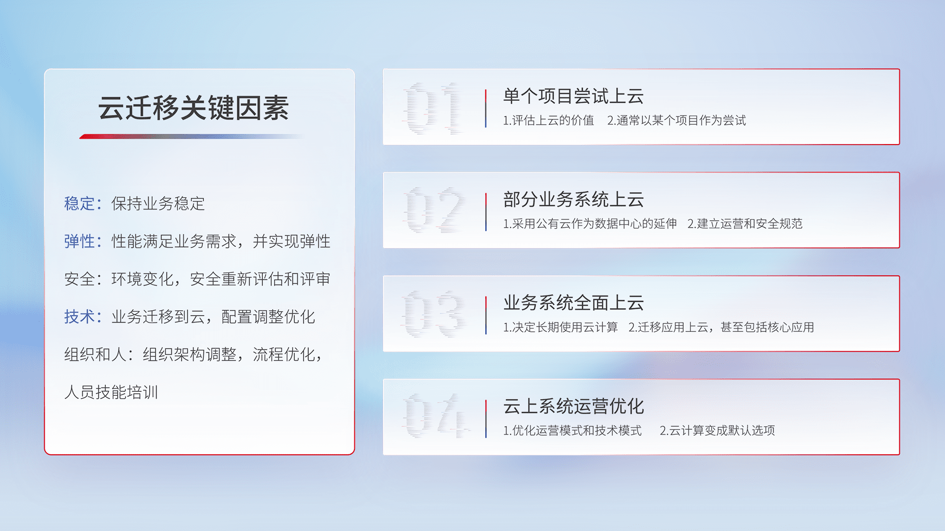 结合实际业务,,,,从规划设计、、、云平台选型、、云原生改造、、、数据迁移、、、集成交付,,迁移全过程为客户识别最佳上云路径,,做好风险识别管理,,设计网络架构、、、、身份权限、、安全审计合规、、、操作审计、、日志审计、、、监控告警策略、、、、多站点容灾设计等,,对云上基础设施进行整体规划,,,,提升IT治理水平,,,,以满足弹性、、、、高可用、、、、高性能的需求。。。