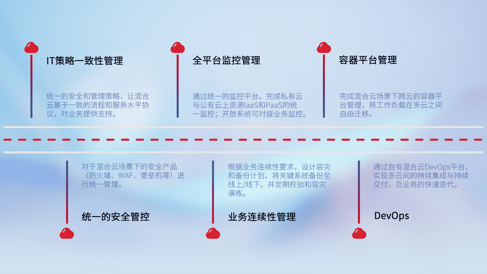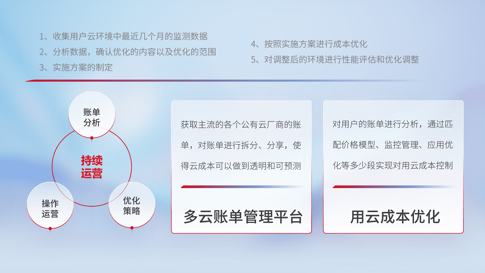 通过多云纳管,,,以统一的资源数据模型把客户的云资源进行抽象和封装,,,,进而实现对多云资源的统一操作,,保障云资源管理的可靠性、、稳定性与可用性。。量身定制化运维内容,,配置、、、开发运维、、、补丁管理、、、、备份、、监控、、、、认证和访问管理、、审计和日常巡检等,,,保障在用云过程中的可靠度,,稳定度以及高可用率。。
