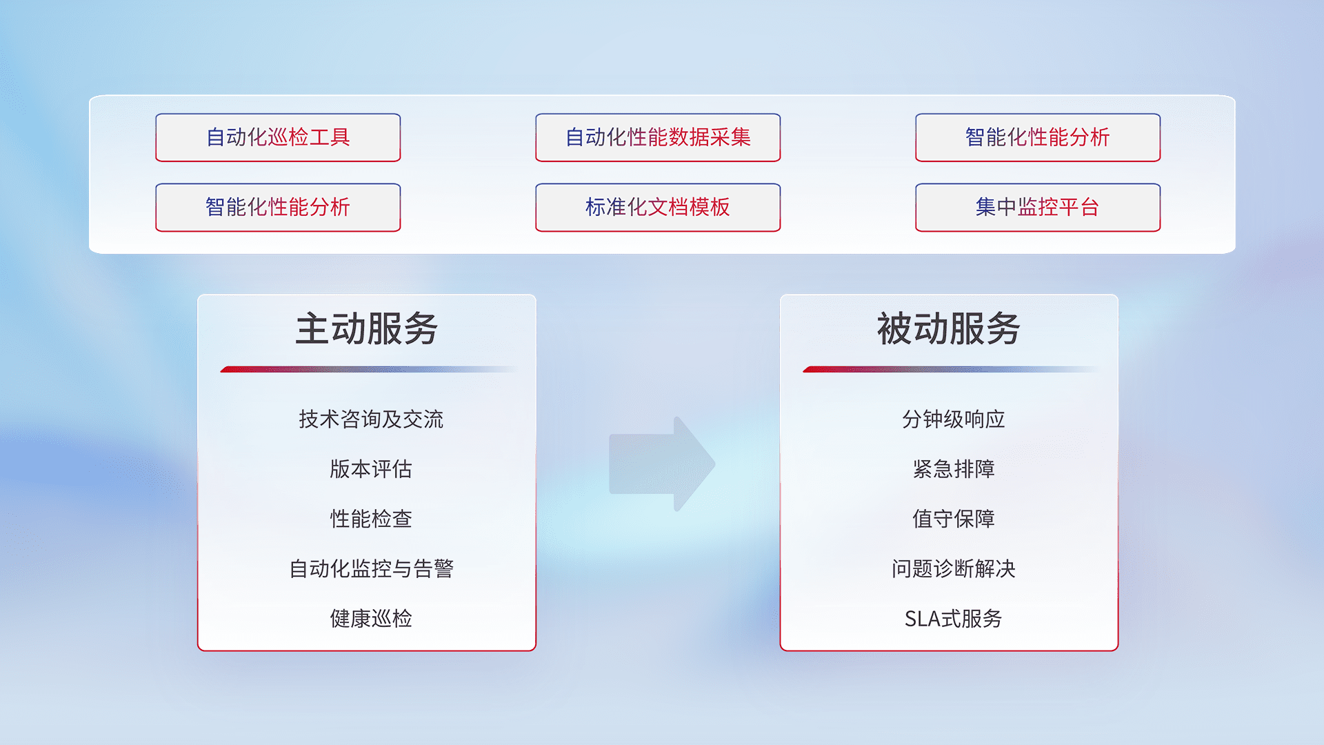智能化工具和标准化文档,,保障服务质量,,提供主动服务(包含技术咨询、、、版本评估、、、性能检查、、、、自动化监控与告警、、、健康巡检)和被动服务包含(分钟级响应、、紧急排障、、、值守保障、、、、问题诊断解决、、SLA服务)。。
